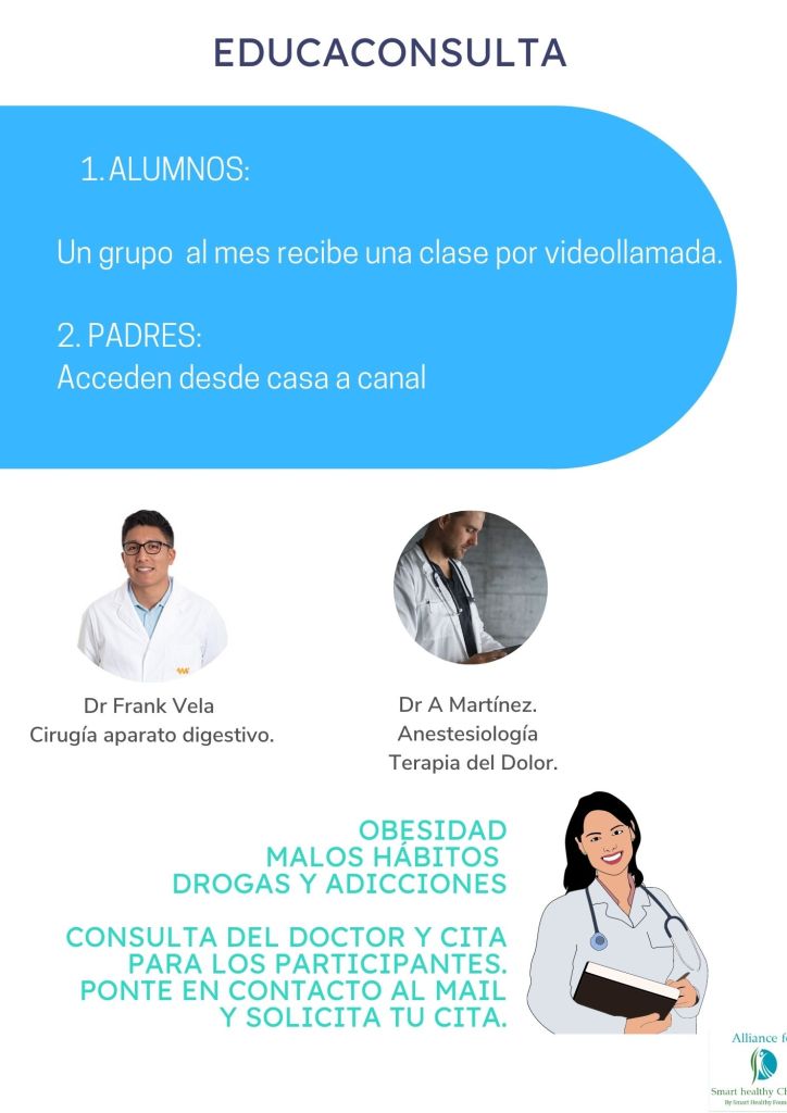 El dr Frank Vela y el dr A. Martínez Benet, estarán en videollamadas y clases on line a los alumnos. Para formarles en prevención, inteligencia digestiva e importancia de educarse contra futuras enfermedades.